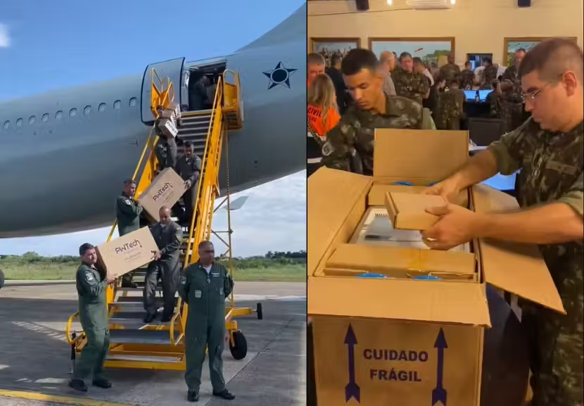 Com o apoio da primeira-dama Janja Silva, a FAB foi acionada porque, segundo Felipe Neto, essa foi a solução que encontraram para levar água potável em áreas onde só dá pra chegar por vias aéreas.