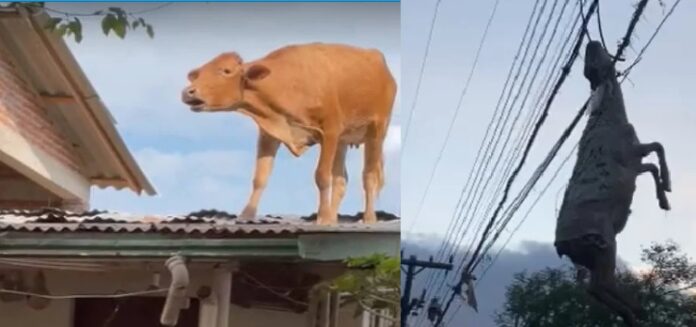 Um vídeo mostra a vaca andando em cima do telhado, logo após o dono chamar por ‘Mimosa’.