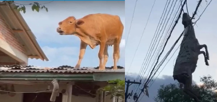 Prefeitura de Estrela, no Rio Grande do Sul, compartilhou a imagem de uma vaca que apareceu no telhado de uma casa após as fortes chuvas que atingiram a região.