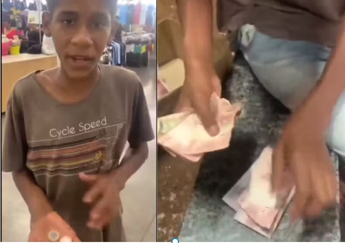 Nas imagens, o garoto, cuja identidade ainda não foi divulgada, aparece segurando as duas únicas moedas que tinha em mãos.