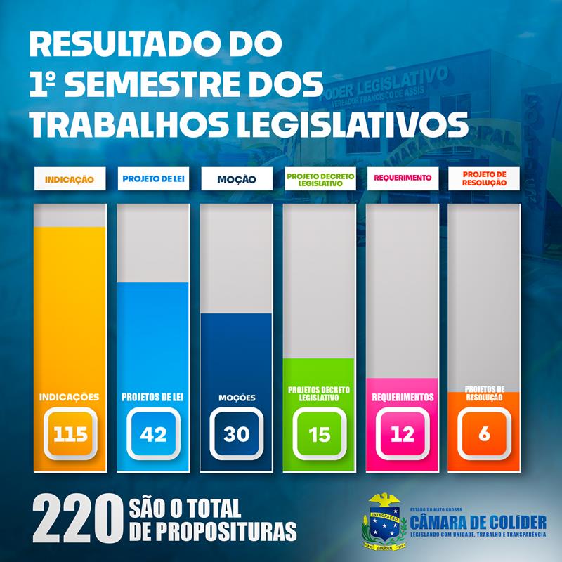 A Câmara Municipal de Colíder encerra o primeiro semestre de 2023 com números expressivos de atuação legislativa. Durante esse período, os vereadores apresentaram um total de 220 proposituras, entre indicações, requerimentos, moções, projetos de lei, projetos de decreto legislativo e projetos de resolução. Essas ações refletem o empenho e dedicação dos legisladores em representar os interesses da população e propor mudanças que impactam diretamente no desenvolvimento do município.