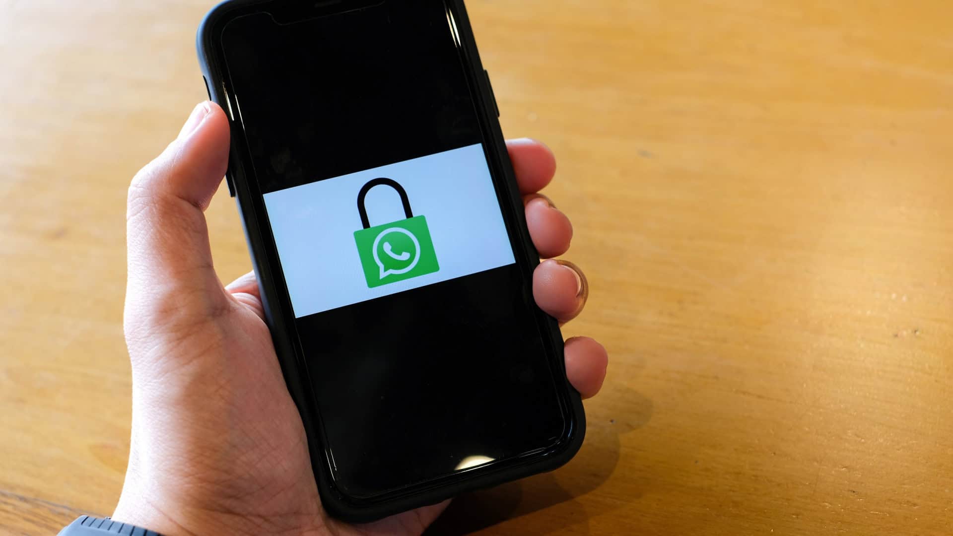 Mão humana segurando um smartphone exibindo um cadeado formado com a logomarca do WhatsApp